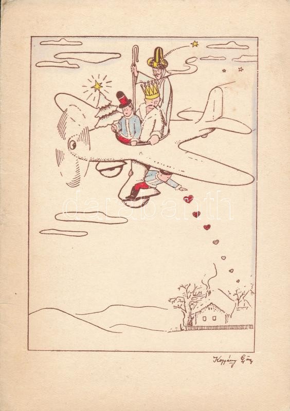 B. Koppány György: Karácsonyi üdvözlőlap. Színezett rézkarc papír, jel...