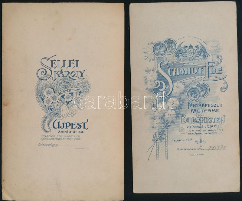 Description: cca 1860-1890 Vegyes keményhátú fotótétel, 10 db, Bp. Singberger Béla, Bp. Schöfft K., Ujpest Sellei Károly, Szabadka Pietsch Ferenc, Bp. Pobuda Károly, Bp. Schmidt Ede (4 db), 16x10 cm és 21x13 cm közötti méretben.