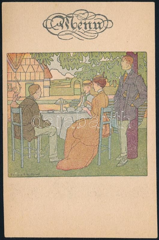 cca 1910-1920 Bernard B. Monvel (1881-1949) által tervezett menükártya, 13x9 cm