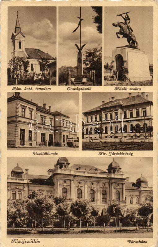 Kisújszállás, Római katolikus templom, Országzászló, Hősok szobra, Vasútállomás, Kir. Járásbíróság, Városháza, Gárdony és Fenyvesi kiadása (EB)