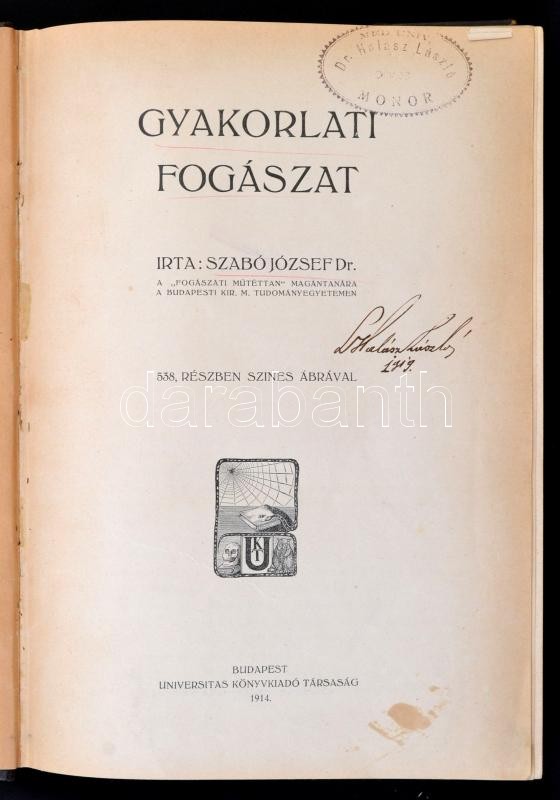Dr. Szabó József: Gyakorlati fogászat. Bp., 1914, Universitas Könyvkiadó Társaság, VIII+419 p. Első kiadás. Gazdag szövegközti képanyaggal. Átkötött félvászon-kötés, kopottas borítóval, sérült gerinccel, néhol ceruzás aláhúzokkal, belelülésekkel, de alapvetően jó állapotban. Halász László monori orvos névnélyegzőjével, és 1919-es névbejegyzésével.