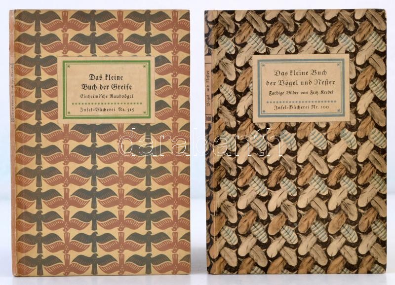 Insel Bücherei sorozat két kötete (Nr. 100., 158.) Das kleine Buch der Greise. Einheimische Raubvögel. Das keline Buch der Vögel und Nester. Leipzig, é.n., Insel-Verlag. Kiadói kartonált papírkötés, színes egészoldalas illusztrációkkal, német nyelven./ Two books from the series of Insel Bücherei.(Nr. 100., 158.) Paperbinding, with colourfull illustrations, in German language.