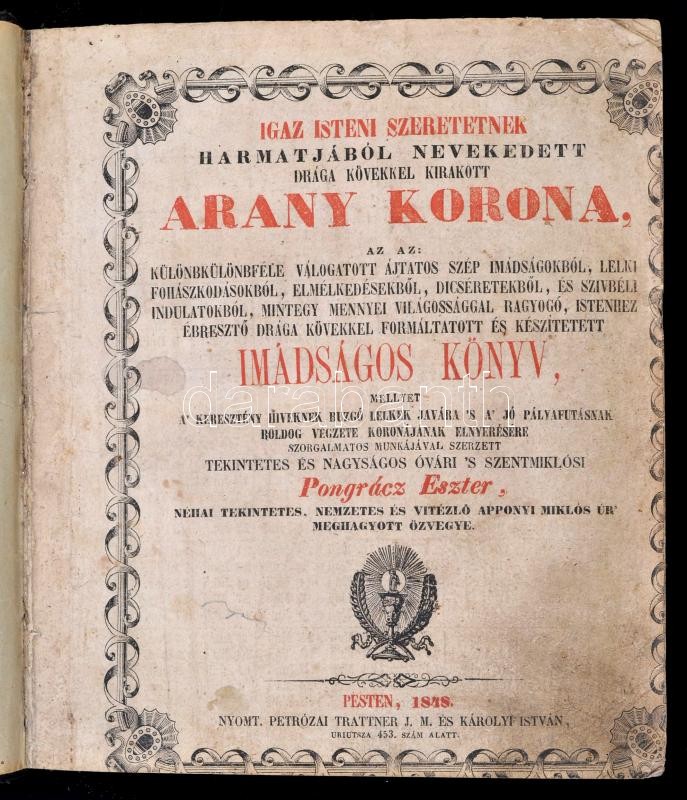 Description: Pongrácz Eszter: Igaz isteni szeretetnek harmatjából nevelkedett drága kövekkel kirakott arany korona [...] imádságos könyv. Pest, 1848, Trattner. Kicsit foltos, későbbi bőrkötésben, jó állapotban.