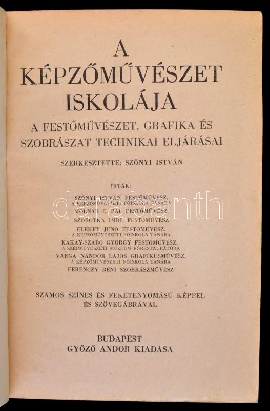 Description: Szőnyi István (szerk.): A képzőművészet iskolája. A festőművészet, grafika és szobrászat technikai eljárásai. Bp., 1941, Győző Andor kiadása. Félvászon kötésben.