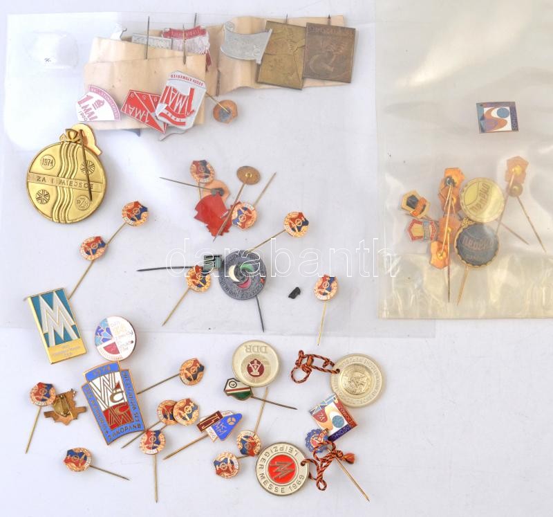 Description: Vegyes, kis zacskónyi szocialista jelvény és kitűző tétel, közte "Május 1." téma, különböző cégek jelvényei, egy része "Bulgária" feliratú bőrtokban T:vegyes