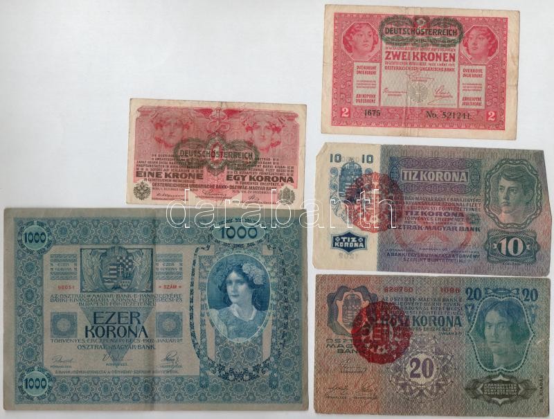 https://www.darabanth.com/en/297-Online-auction/297.0/Numismatics/Hungarian-Banknotes~500007/1902-1917-1K-1000K-5xklf-kozte-4db-felulbelyegzett-TIII-III-~II1590336