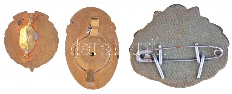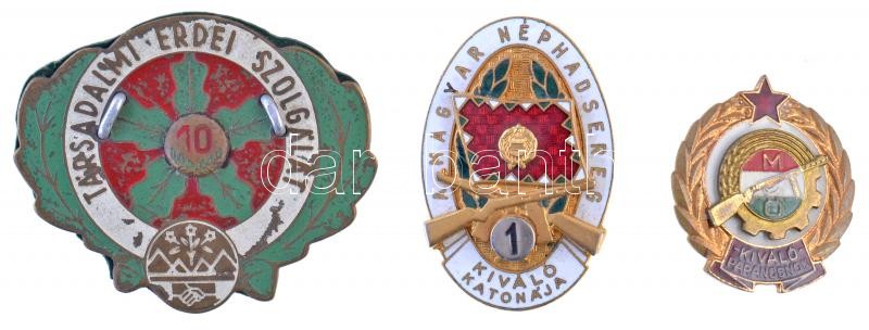 ~1960. "A Magyar Néphadsereg Kiváló Katonája" első osztály, aranyozott zománcozott jelvény (31x47mm) + ~1960-1970. "Kiváló Munkásőr Parancsnok" zománcozott, aranyozott jelvény (31-35mm) + DN "Társadalmi Erdei Szolgálat" festett fém jelvény (48x57mm) T:2,2- festékhiba, egyiken tűhiány