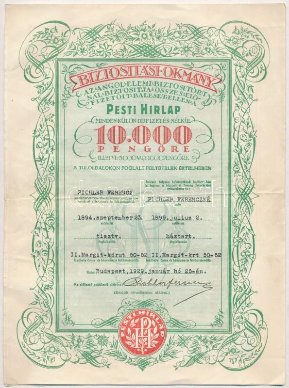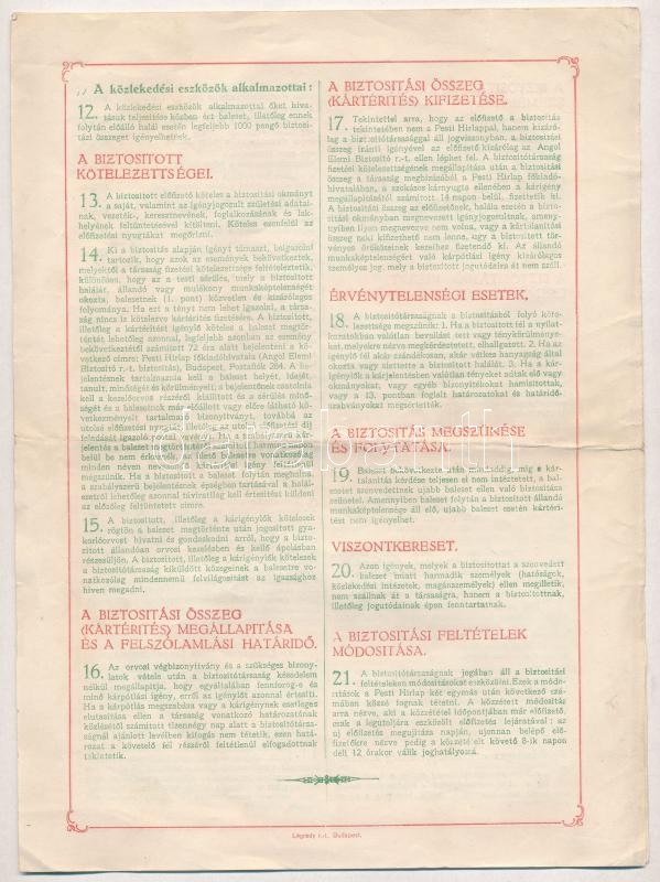 Description: Budapest 1929. "Angol Elemi Biztositó RT" névre szóló biztosítási okmánya a Pesti Hírlap előfizetőinek 10.000P-ről, kitöltött, további oldalakon az általános balesetbiztosítási feltételek T:III