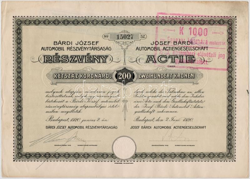 https://www.darabanth.com/en/297-Online-auction/297.0/Numismatics/Shares-and-Tickets~500005/Budapest-1920-Bardi-Jozsef-Automobil-Reszvenytarsasag-reszvenye-200K-rol-szarazpecset~II1588148