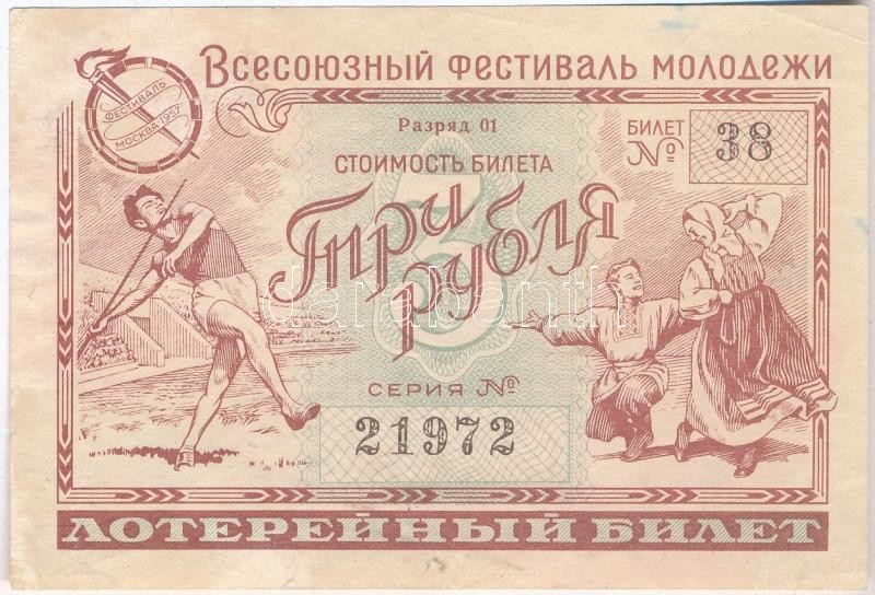 Soviet Union 1957. "6th World Festival of Youth" lottery ticket about 3 Rubles C:F small tear