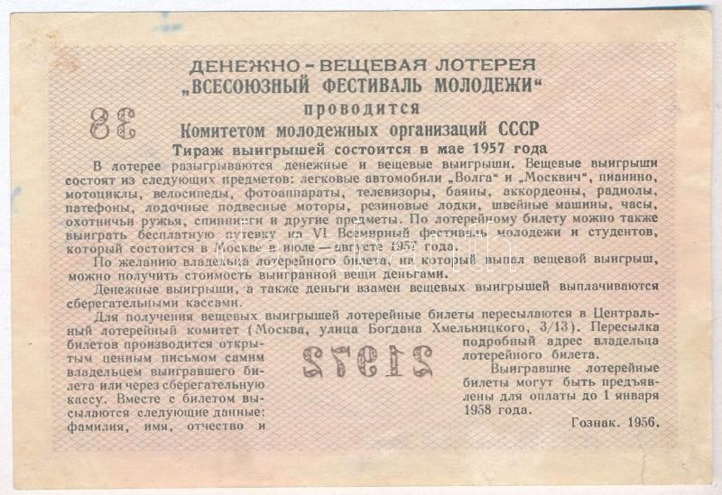 Description: Szovjetunió 1957. "6. Világifjúsági Fesztivál" sorsjegy 3R értékben T:III kis szakadás