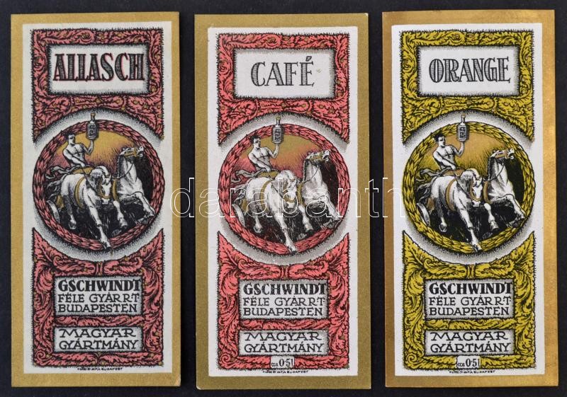cca 1910 Gschwindt-féle Gyár Rt. likőr italcímke, 3 db, Klösz Gy. és F...