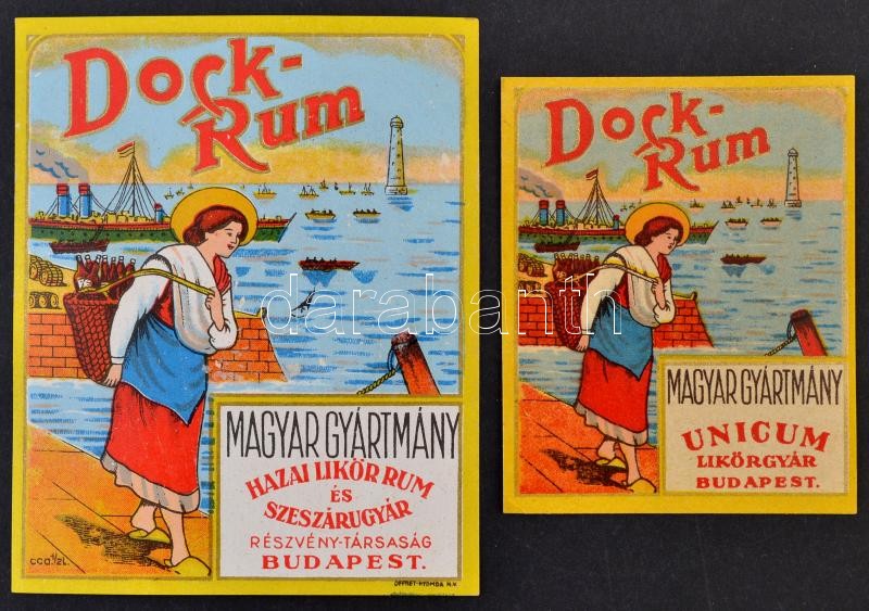 cca 1940 Dock-Rum italcímke, 2 db, Unicum Likőrgyár, Hazai Likőr, Rum, és Szeszárugyár Rt., 7x5,5 cm és 9,5x7,5 cm