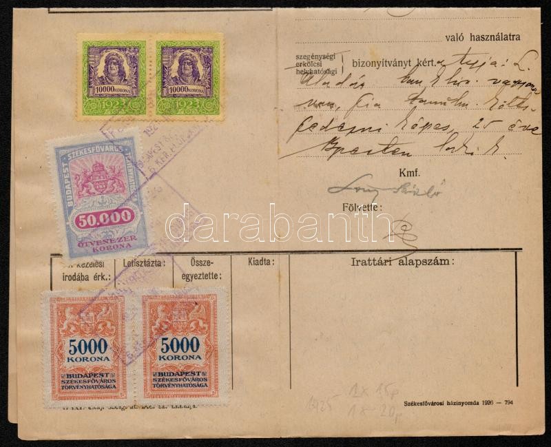 1925 Okmány 2 x 10.000K + 60.000K Budapest városi illetékbélyeggel