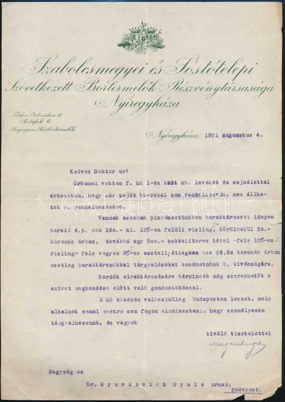 1921 Nyíregyháza, A Szabolcsmegyei és Sóstótelepi Szövetkezett Bortermelők Részvénytársasága fejléces levélpapírjára írt levél