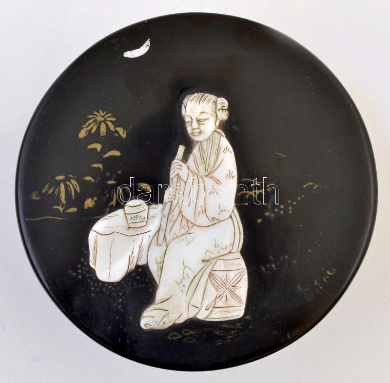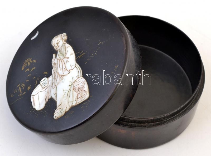 Távol-keleti lakk szelence, gyöngyház berakással, festéssel, kis sérülésekkel, kopás nyomokkal, 6x11 cm.