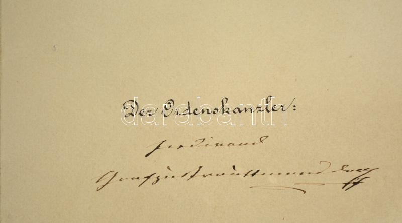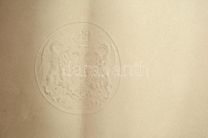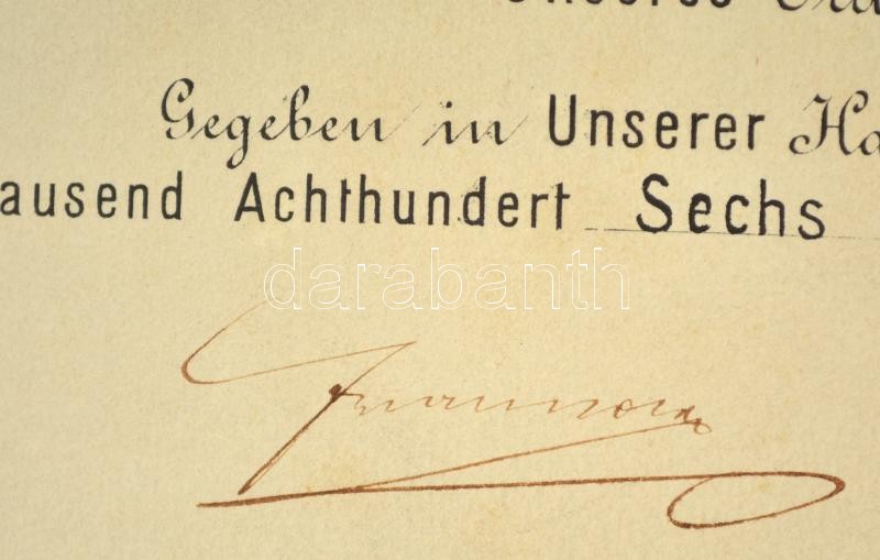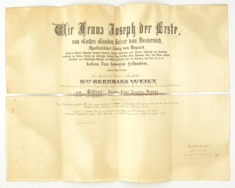 1896 A Ferenc József-rend lovagkeresztjének adományozó oklevele, Dr. Weisz Bernát bártfai közjegyző részére, Ferenc József és a rend kancellárjának saját kezű aláírásával, rányomott szárazpecséttel, Weisz Bernátot a kitüntetéssel ábrázoló műtermi fotóval, hajtásnál elvált, 54x72 cm / Awarding document of the Order of Franz Joseph Knight's Cross for dr. Bernhard Weisz, with embossed stamp and autograph signature of Franz Joseph and the Order's Cancellor, folded, torn in two, 54x72 cm