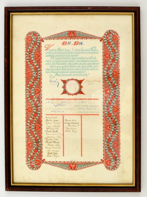 Description: 1931 A nyírbátori polgári általános iskola irredenta emléklapja, bélyegzővel, a tanulók névsorával (köztük az Andrássy-család egy tagjával), üvegezett fa keretben