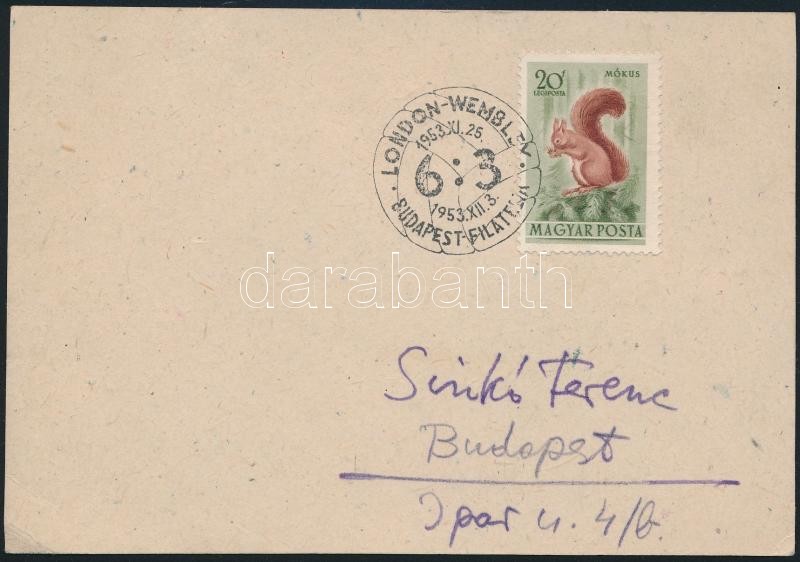 1953 Az angol-magyar 6:3-as futballmeccs emlékbélyegzős levelezőlapja Sinkó Ferencnek címezve