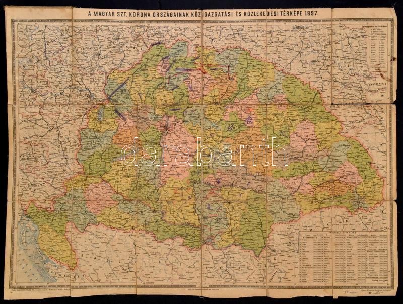 Description: 1897 Homolka: A Magyar Szent Korona Országainak közlekedési és közigazgatási térképe. Vászonra kasírozva. Firkákkal. Egy-két hajtásnál szakadt. 70x60 cm