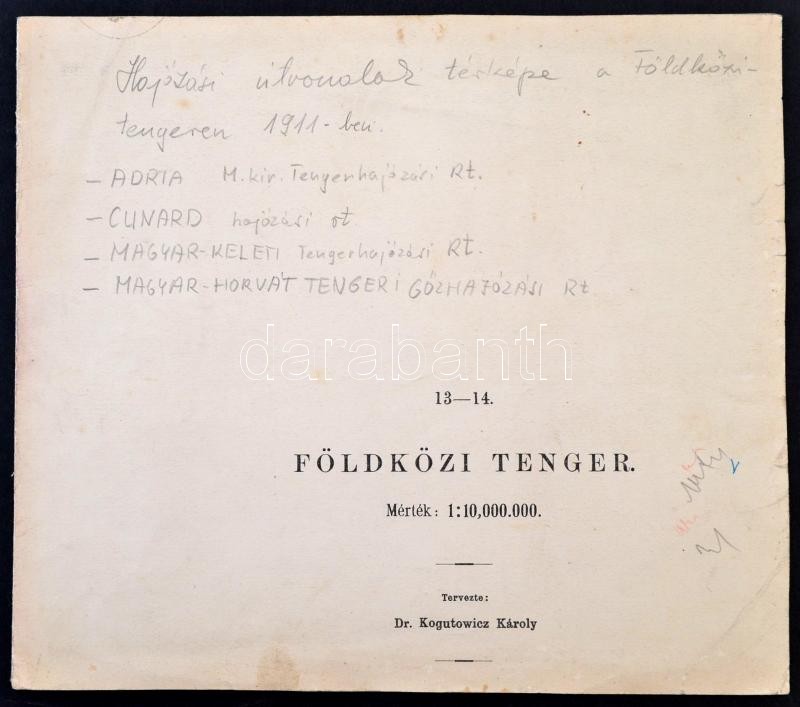 1911 Magyar hajós társaságok hajózási útvonalai a Földközi tengeren Adria, Magyar-Keleti, Magyar-Horvát, Cunard. Kogutowitz 50x23 cm
