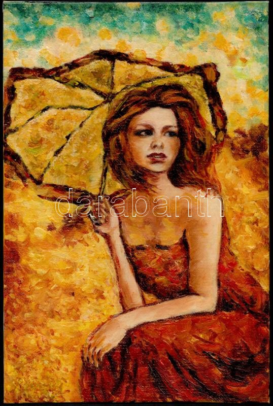 Jelzés nélkül: Lány ernyővel, olaj, vászon, 30×20 cm