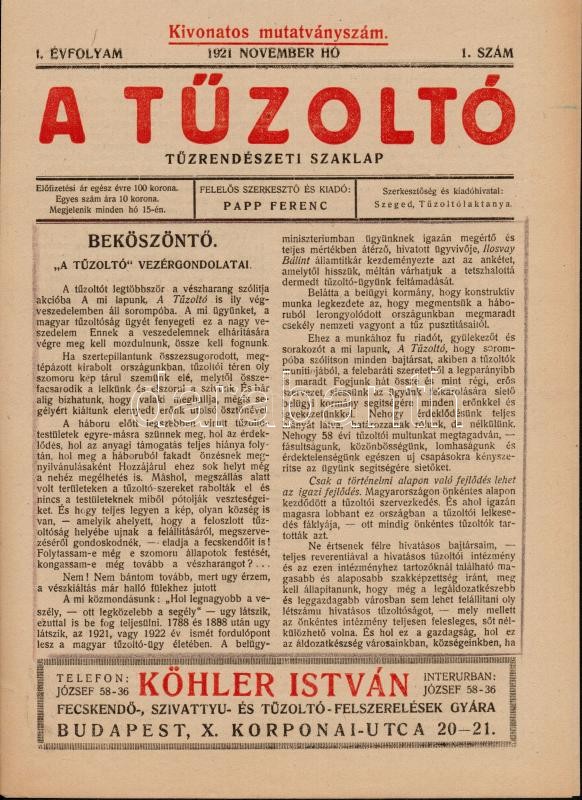 1921 A Tűzoltó c. újság induló száma