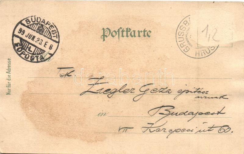 1899 Hrusovany nad Jevisovkou, Grusbach; Kirche, Gräfl. Krankenhaus, Zuckerfabrik, Schloss Emmahof, Gräfl. Khuen-Belasi Schloss / general view, church, castles, sugar factory, hospital, Kunstanstalt Karl Schwidernoch floral Art Nouveau litho (gyűrődés / crease)