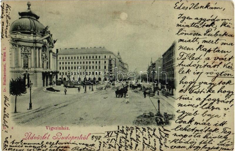 1898 Budapest XIII. Vígszínház, villamos sínfektetés, D. Halberstadt kiadása (EK)