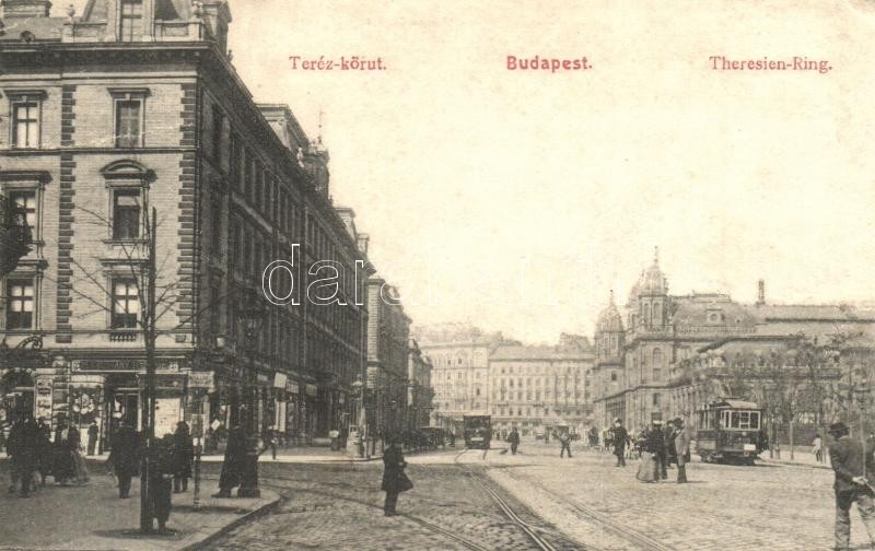 Budapest VI. Teréz körút, dohánytőzsde, villamosok, M. T. és F. I. Koc...