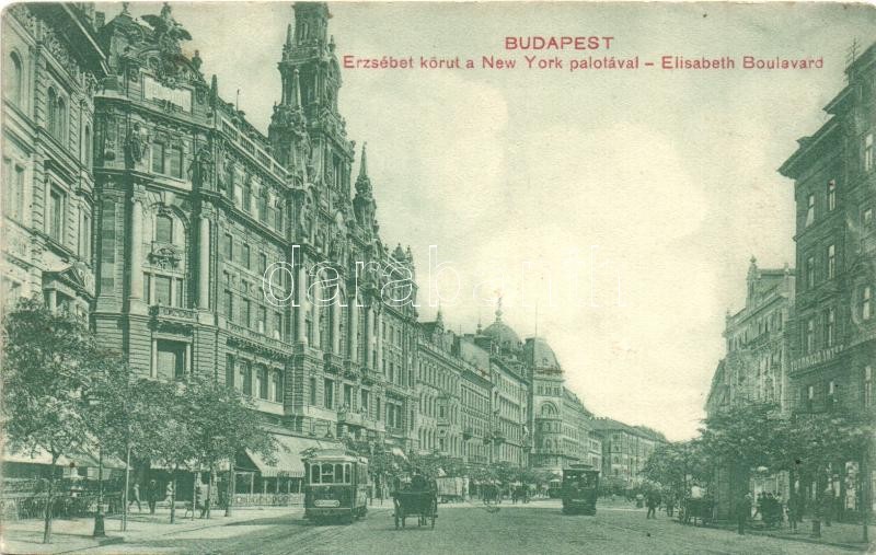 Budapest VII. Erzsébet körút a New York palotával, villamosok, Tudakoz...