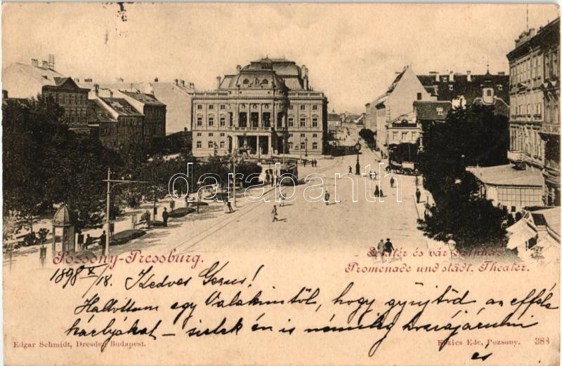 1898 Pozsony, Pressburg, Bratislava; sétatér és városi színház, villamos, Edgar Schmidt kiadása / promenade, theater, tram (EK)