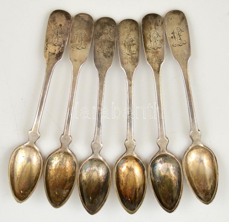 Ezüst (Ag.) mokkás kanál készlet (6 db), monogramos, jelzett, mesterjeggyel, h: 11 cm, nettó: 61 g