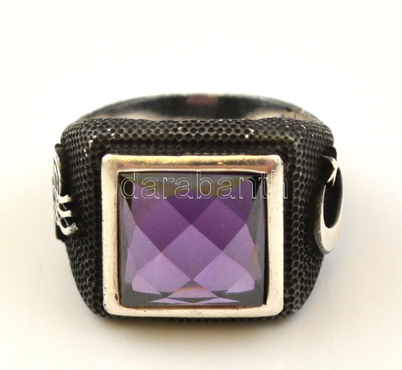 Ezüst(Ag) lila üveg kővel díszített keleti mintás gyűrű, jelzett, méret: 59, bruttó: 13,5 g