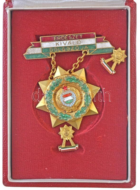~1960-1970. "Erdészet Kiváló dolgozója" aranyzott, festett és zománcozott kitüntetés eredeti, kissé sérült tokban, két miniatűrrel T:2,2-