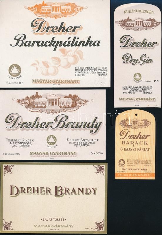 cca 1930 5 db különféle Dreher italcímke: brandy, pálinka, gin, 9x5 és 11x14 cm közötti méretben