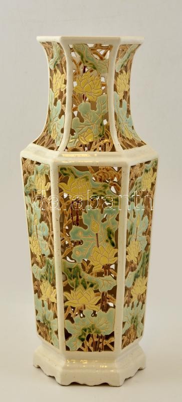 Áttört szélű padlóváza, kézzel festett, kopott, jelzés nélkül, alján l...