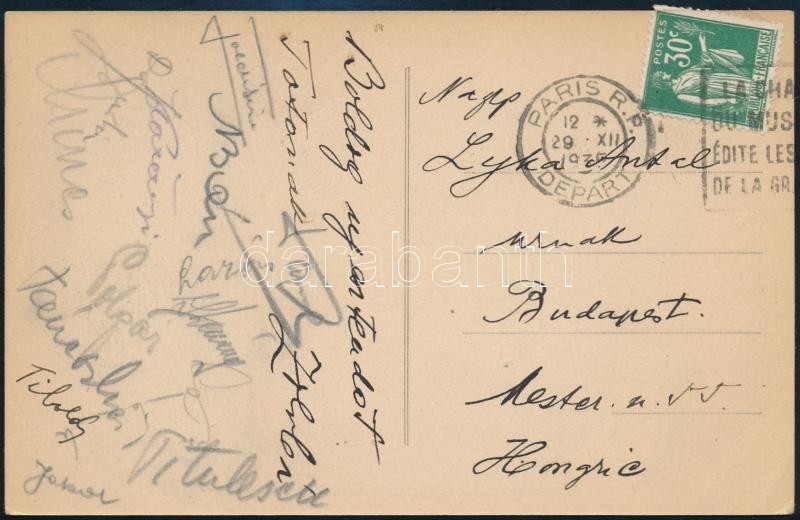Description: 1929 A Ferencváros labdarúgó csapatának párizsi útjáról küldött képeslap a játékosok (pl.: Toldi, Lázár, Takács stb...) aláírásával. / 1929 Signed postcard of the FTC from France