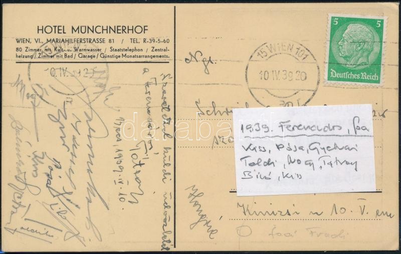 1939 A Ferencváros játékosainak (Kiss, Gyetvai, Toldi, Pósa, Nagy, Bíró, ) aláírásai Bécsből küldött levelezőlapon