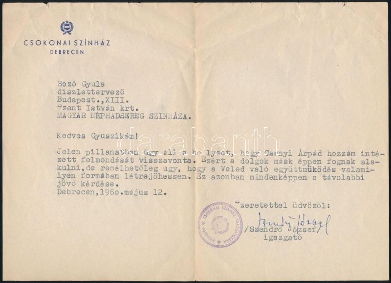 Description: 1960 Szendrő József (19141971) Jászai Mari-díjas magyar színész, rendező, műfordító, színházigazgató aláírása, színházi együttműködéssel kapcsolatos gépelt levélen, Bozó Gyula (1913-2004) grafikus-iparművésznek címezve, 15x20,5 cm