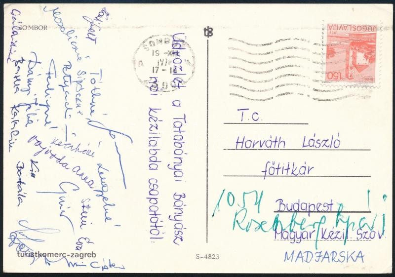 197? a Tatbányai Bányász kézilabda csapat tagjainak aláírásai Zágrábból készült levelezőlapon
