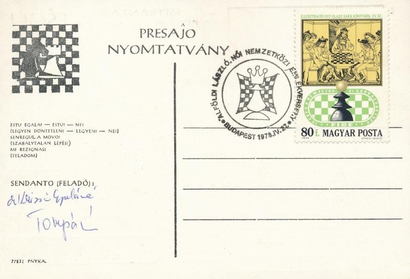 1978 az Alföldi László sakk emlékverseny két női sakkmester résztvevőjének aláírása emléklapon