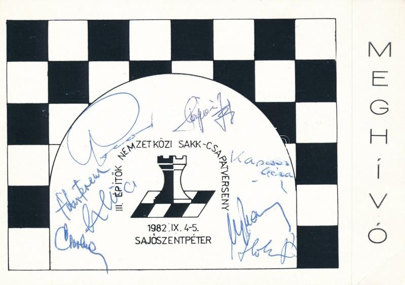 1982 az III. Építők nemzetközi sakk-csapatverseny résztvevőinek aláírásai meghívón