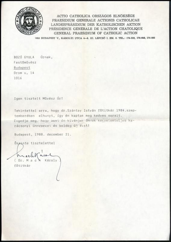 1988 Dr. Mach Károly az Actio Catholica főtitkárának aláírása Bozó Gyula (1913-2004) grafikus-iparművésznek írt fejléces levélen, 29,5x21 cm