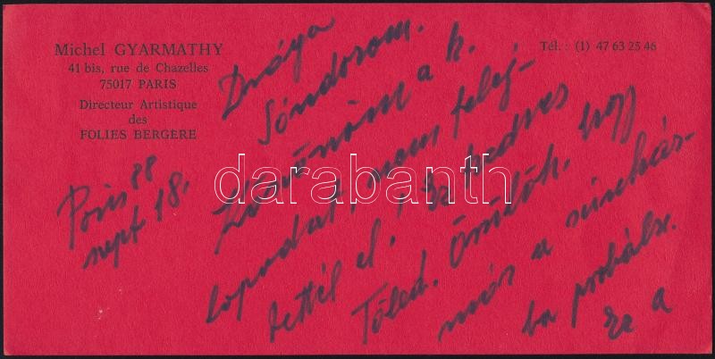 1988 Michel Gyarmathy (1908-1996) zsidó származású rendező, díszlet és jelmeztervező saját kezű sorai és aláírása egy levélen, borítékkal.