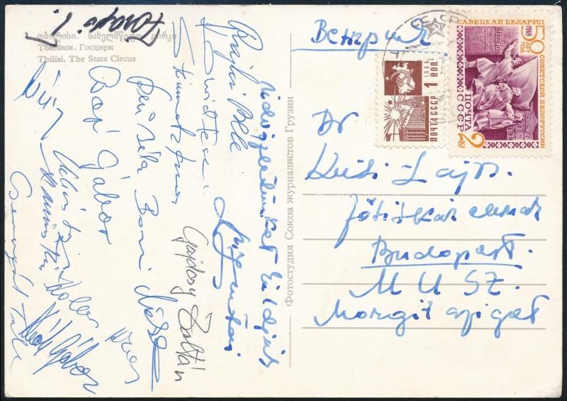 cca 1976 A vízilabda válogatott tagjainak aláírása a Tbilisziből hazaküldött képeslapon (Csapó, Faragó, Gajdosy, Steinmetz, Rajki, stb.)