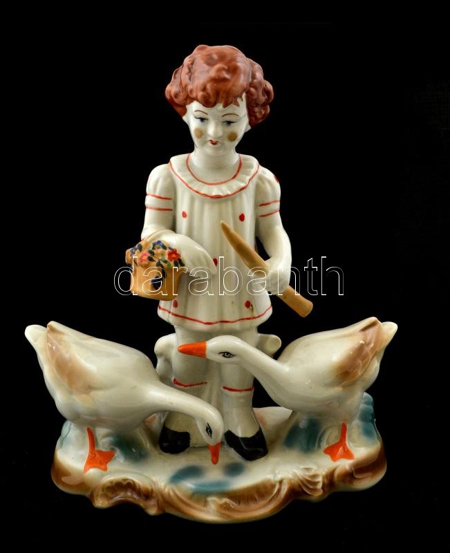 Arpo kislány libákkal, kézzel festett, jelzett, hibátlan, m:20 cm, h:1...