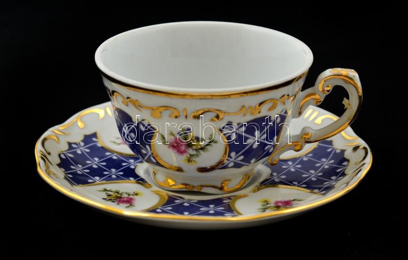 Zsolnay mokkás csésze és alj, részben kézzel festett, jelzett, hibátla...