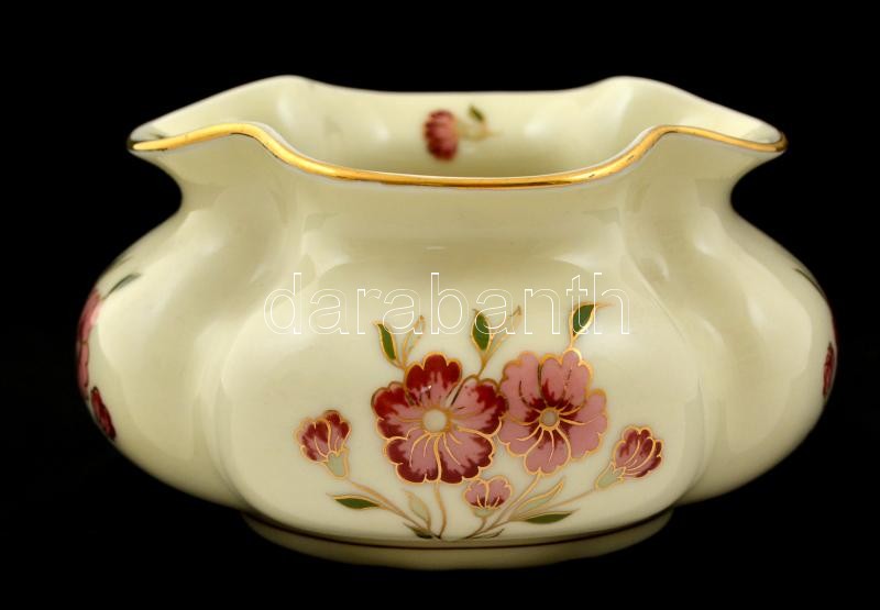 Zsolnay virág mintás kis kaspó, kézzel festett, jelzett, hibátlan, m:6,5 cm, d:12 cm