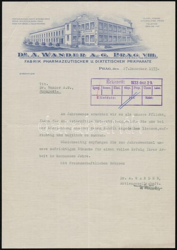 1933 Dr. A. Wander A.-G. gyógyszergyár levele díszes fejlécű papíron, ... https://www.darabanth.com/en/298-Online-auction/298.0/Other-collectibles/Documents~100016/1933-Dr-A-Wander-A-G-gyogyszergyar-levele-diszes-fejlecu-papiron-Praga-nemet-nyelven~II1595299